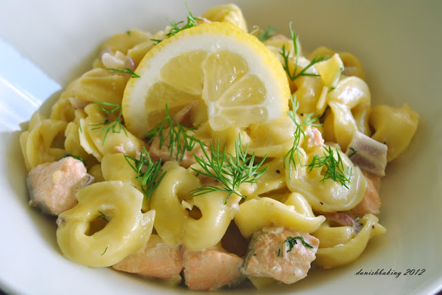 Pari minuuttia ennen kuin tortellinit ovat valmiit paista sipuli ja lohi nopeasti öljyssä. Lisää kerma ja anna kiehua muutama minuutti.